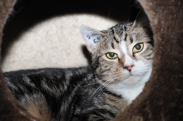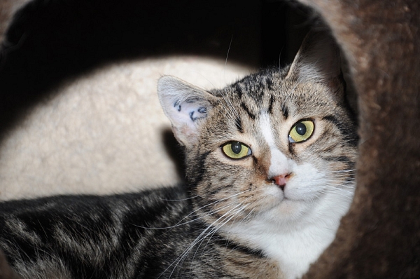 24.11.2012: Toshi ist ein lieber und eher ruhiger Kater. Gegenüber Menschen ist er eher schüchtern und zurückhaltend. Durch die vielen Besucher vor Weihnachten war er sehr eingeschüchtert und hat auf den Rohren an der Decke gesessen und mit grossen ängstlichen Augen in die Welt geschaut. Wir hoffen, daß es jemanden gibt, der Toshi eine Chance geben wird.